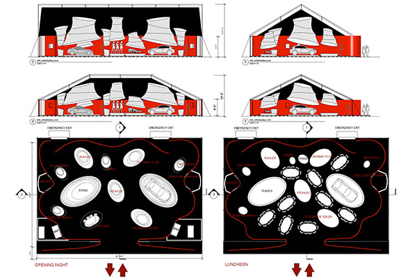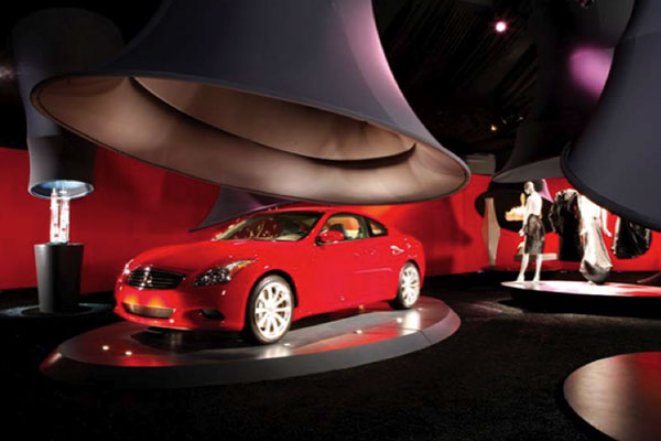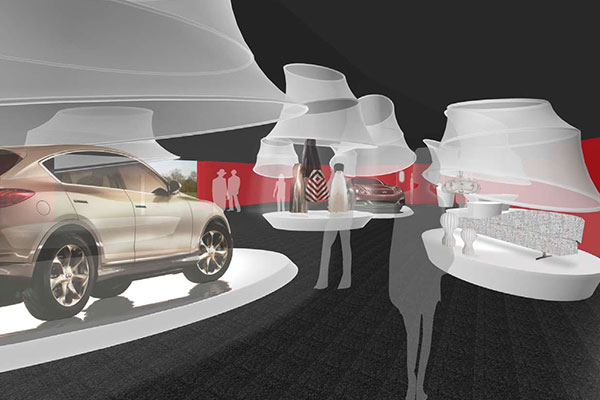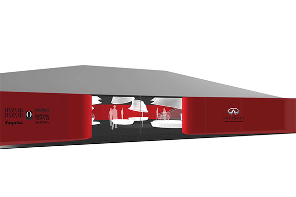 The concept of the Infiniti Gallery of Design consists of two primary spatial elements: the Floating Ovals and the Undulating Ribbon. Expressing the concept of “Dynamic Adeyaka,” the signature color of the floating wall is the constant visual element framing the space with calligraphic gestures.