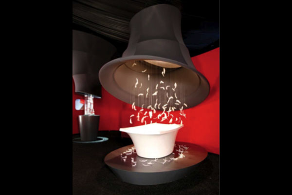 The Floating Ovals are suspended canopies hovering above the ovoid platforms varying sizes which evoke randomly placed lily pads floating around the pond and act as individual mise-en-scènes for the featured products. The Undulating Ribbon embodies fluidity and effortless motion. These combined spatial elements create an overall sense of undulating movement with additional sensory experiences of sound and projected images to complete the exhibition experience.